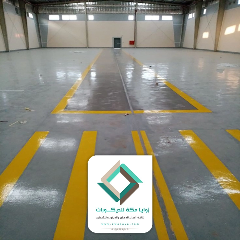 نقوم بتخطيط المسارات والعلامات الإرشادية فوق طبقة دهان ايبوكسي للارضيات .